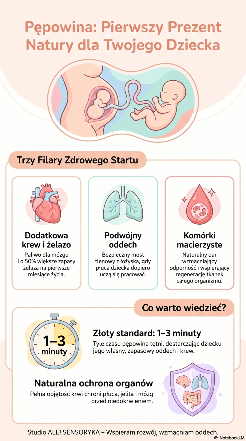 W moim Studio „ALE! SENSORYKA” na warszawskiej Woli codziennie pracuję z dziećmi, kierując się misją: „Wspieram rozwój, wzmacniam oddech”. Jako terapeuta Integracji Sensorycznej i trener oddechu wiem, że droga do pełnego potencjału dziecka zaczyna się znacznie wcześniej niż w gabinecie – zaczyna się od jego pierwszego tchnienia. Najnowsze badania naukowe z 2025 roku rzucają nowe światło na to, jak prosta praktyka – opóźnione odpępnienie (DCC) – buduje biologiczny fundament dla zdrowia i rozwoju noworodka.